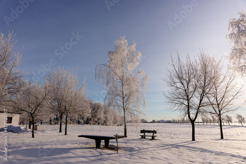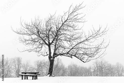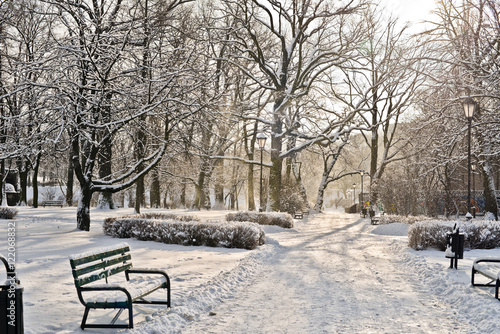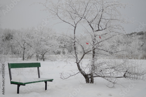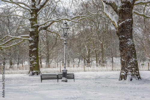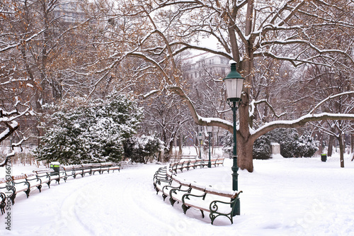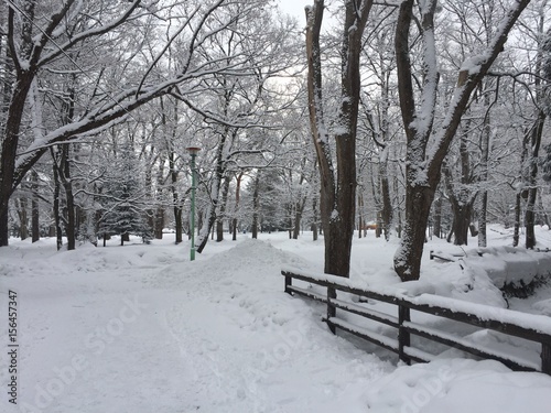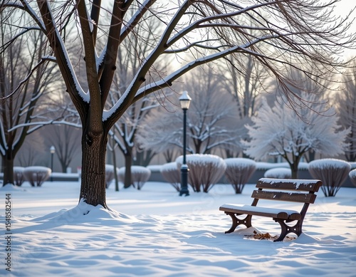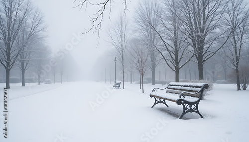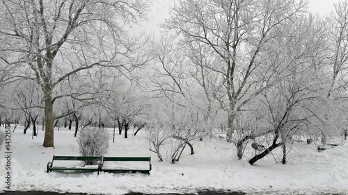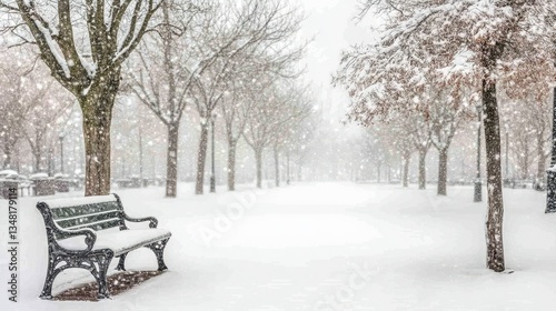 Snow storm in a park with a bench in the foreground. #376107509