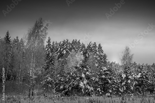 Monochrome wintery woods view, Lithuania. Black and white January morning, trees covered in snow, cold weather. Selective focus on the details, blurred background. #477964289
