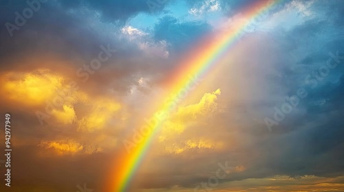 A vivid rainbow brightens the sky, casting hope after a storm, as the sun breaks through lingering clouds. #942977949