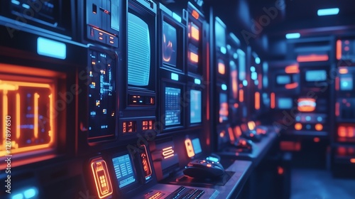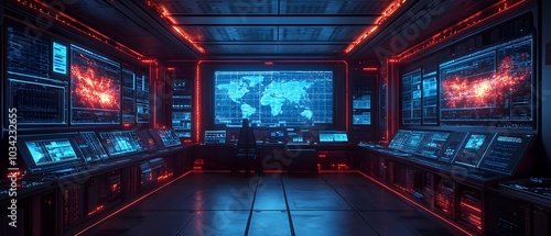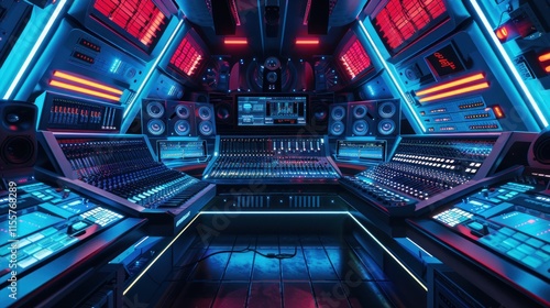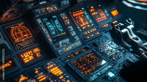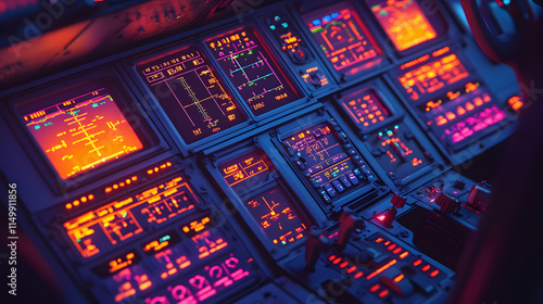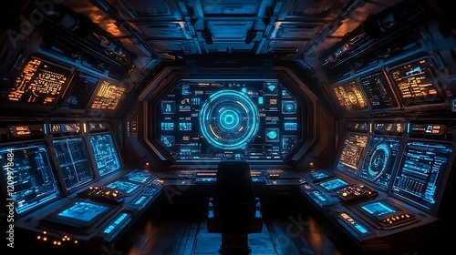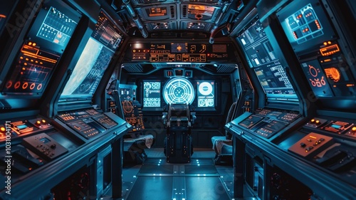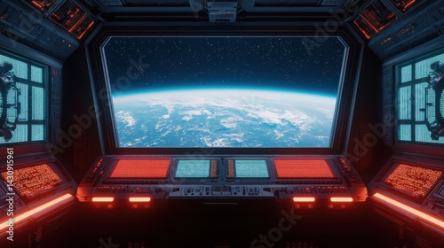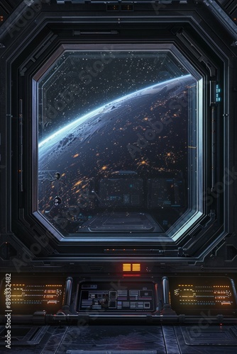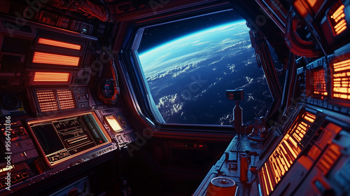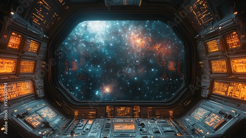 Eleganckie, jasno oświetlone wnętrze statku kosmicznego, z panoramicznym oknem, za którym rozpościera się tajemniczy, ciemny kosmos, dodając scenie poczucia nieskończoności i odkrywania nieznanego. #956470386