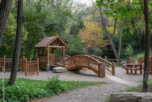 A playground with a wooden playhouse, bridge, and sandpit, surrounded by trees #843337455