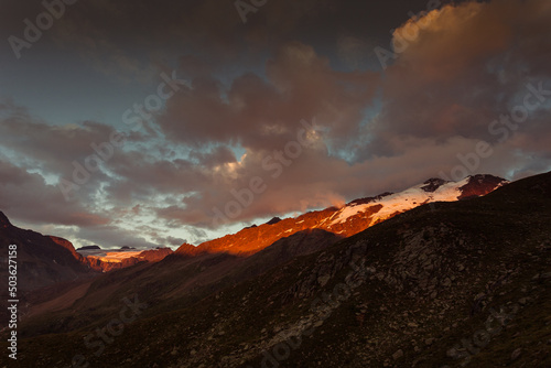 Dramatic sunset panorama of the Gepatschferner and Fontana glacier on the border between Italy and Austria. Mountains popular with hikers and climbers. Vallelunga, Alto Adige, Italy #503627158