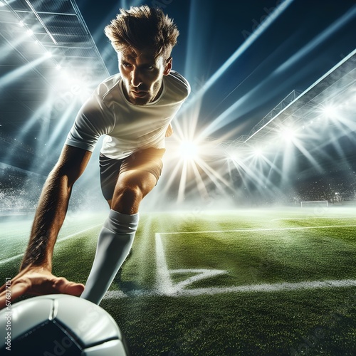Power soccer kick. A soccer player kicks the ball in stadium. Professional soccer player in action. Wide angle. 3d #431392765